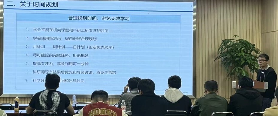 肖怀荣回顾自己的科研经历,对低年级研究生同学提出几点建议。首先是低年级同学应该提高自我要求,做好从被动学习到主动学习的规划,要学会平衡在科研课题和横向项目上的时间,尽可能提前完成任务,拒绝拖延,在工位上要尽可能地提高专注力,高效利用每一分钟。其次要学会与师兄师姐及时沟通并尽快确立自己的研究方向,在科研上遇到困难或者有结果时优先和导师讨论避免走弯路。最后在学习的同时也要注意身体,学会适当放松。