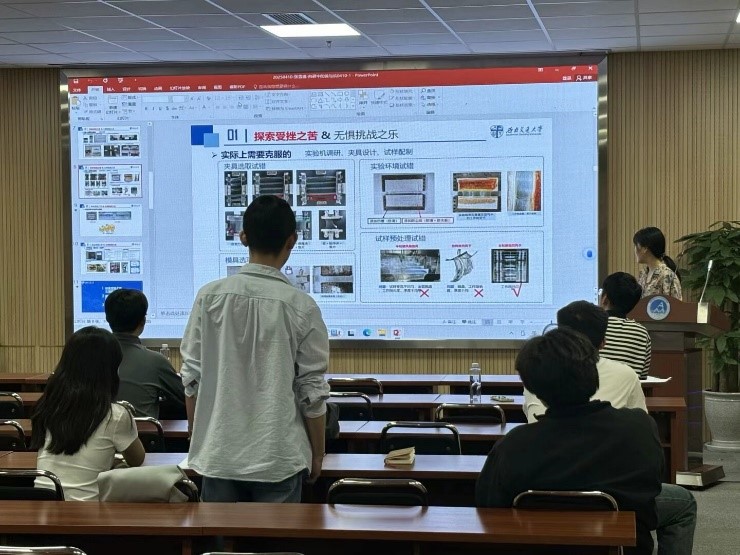首先是“研究生分享”环节。张雪莲以“科研中苦乐交织与自我成长”为题展开分享。她讲述了在科研道路上遭遇挫折、面临质疑时的内心挣扎与应对历程,生动呈现了个人在困境中如何调整心态、汲取经验实现成长。