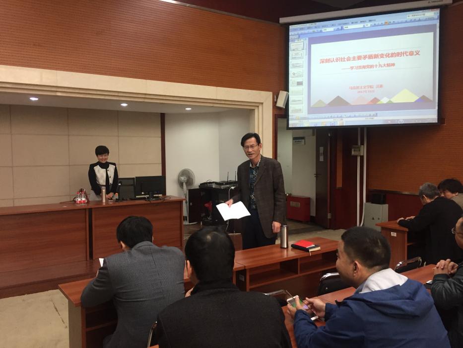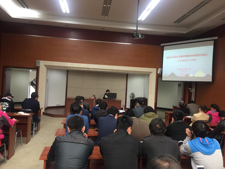 认真学习宣传贯彻党的十九大精神,是力学学院当前和今后一个时期的首要政治任务。为了更好地推动学院全体教职工学深悟透践行党的十九大精神,2017年11月9日下午14:30,力学学院主动联系邀请“太阳集团2138学习贯彻党的十九大精神宣讲团”成员汪澎老师宣讲十九大精神。本次宣讲的地点是九里校区1号综合楼240学术厅,宣讲的主题是《深刻认识社会主要矛盾新变化的时代意义—学习贯彻党的十九大精神》,力学学院全体教职工认真聆听了此次讲座。本次宣讲由学院党委金建明书记主持。