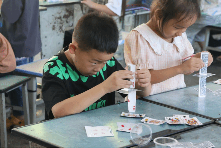 小学员搭建纸牌建筑