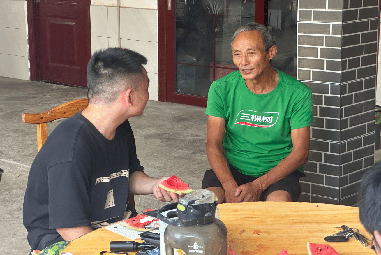 实践队深入留守老人家中开展精准服务。结合永丰村多发电信诈骗案例,队员们创新制作《防诈骗方言-普通话对照表》,将“冒充村干部收费”等常见骗术翻译成通俗普通话,如请老人对照表格跟读:“这是诈骗电话,我要报警!”在队员协助下,78岁的李大爷首次用普通话给外地孙子发送微信语音:“爷爷学会防骗了,别担心!”值得一提的是实践队在走访过程中受到了当地村民的热情欢迎。特别是去李树全老爷爷家里时,刚进门说明来意后,爷爷就招呼大家坐下,又是搬板凳又是开风扇,安顿好大家后就抱出来一个大西瓜,更不顾队员劝阻执意切开分给大家,让大家很是感动。活动同步记录老人用方言讲述的“永丰农耕记忆”,形成珍贵口述档案。