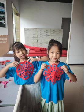 当日下午,支教队举办了“小小剪纸客”活动。支教队员们详细介绍了剪纸的历史渊源和技法,并进行现场示范。随后,学生们进行自主创作。在支教队员全程指导下,学生们纷纷完成并展示了自己的作品。