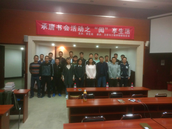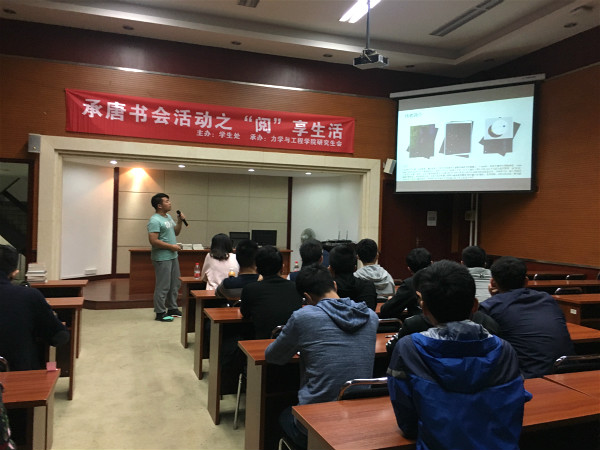 11月9日晚7时,由太阳集团2138学生处主办,力学与工程学院研究生会承办的承唐书会之“阅”享生活活动在九里校区综合楼二楼学术报告厅顺利举行。此次活动邀请李翔宇老师、张英蓉老师担任评委,全体研究生一同聆听。