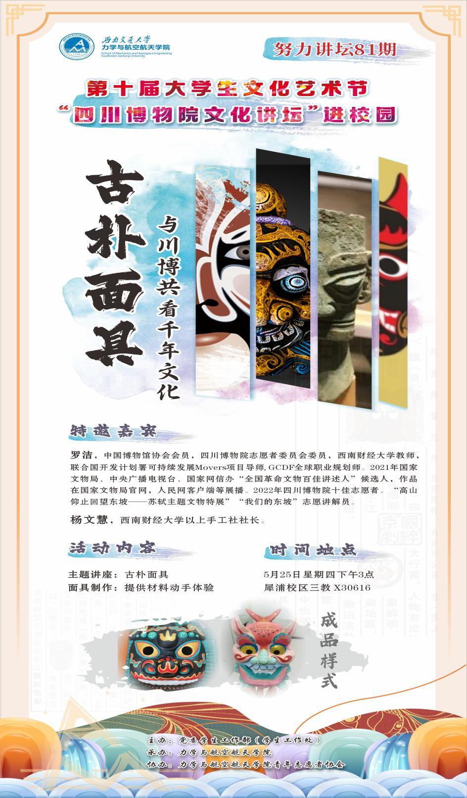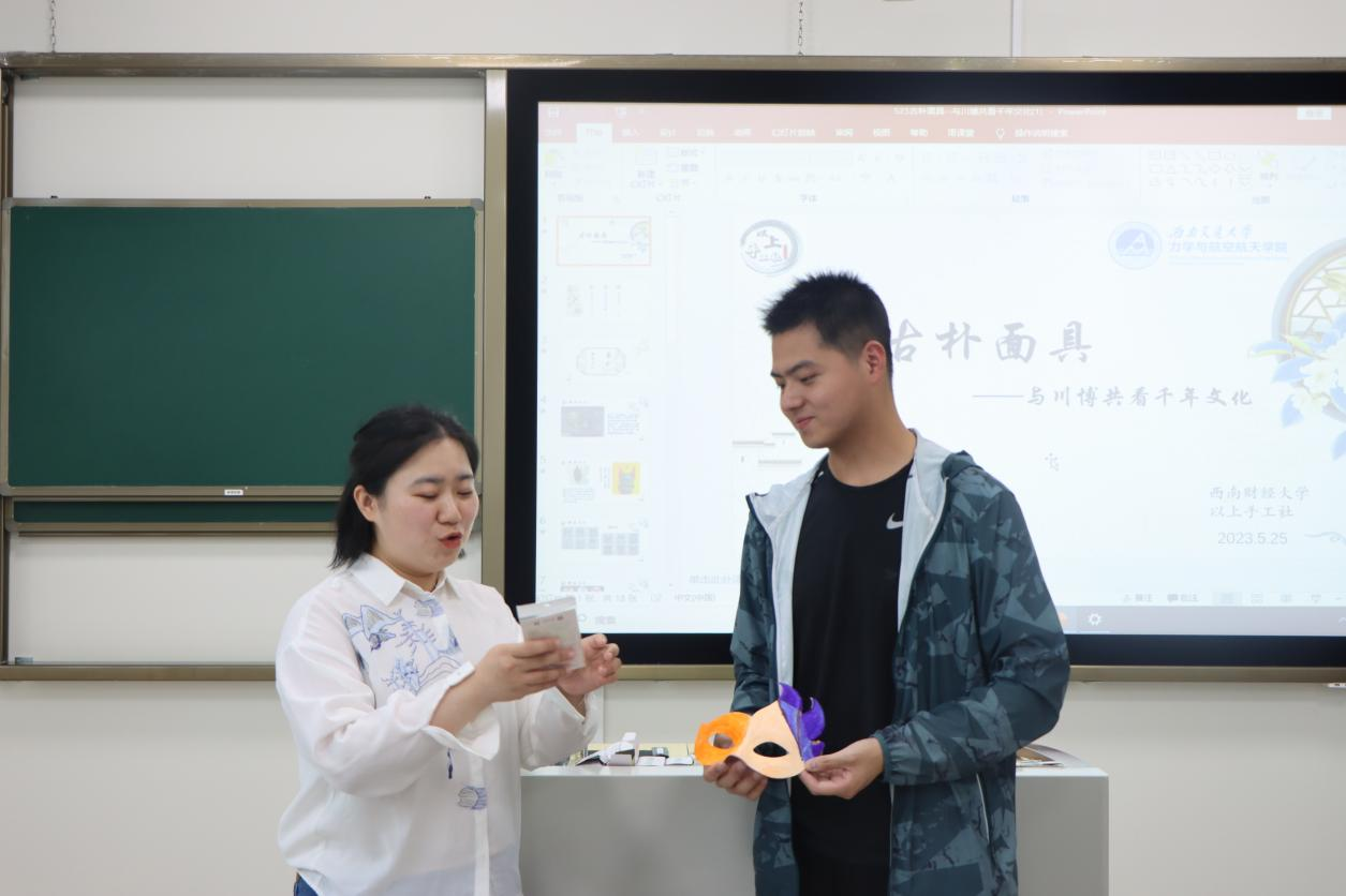 5月25日下午3点,2138cn太阳集团古天乐在犀浦三教X30616顺利开展主题为“古朴面具:与川博共看千年文化”的第十届大学生文化艺术节活动,来自全校120余名师生在“525·我爱我”这特殊的一天从“心”开始,绘出色彩,共享川博文化魅力。