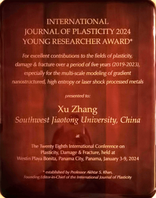 第28届塑性、损伤、断裂国际学术大会于2024年1月3日-9日在巴拿马召开,会议颁发了Khan International Award(Khan国际奖)和International Journal of Plasticity Young Researcher Award(IJP青年学术奖)两个奖项。西南交大2138cn太阳集团古天乐张旭教授因在梯度结构材料、高熵合金和激光冲击强化材料的多尺度模拟相关领域的杰出贡献(multi-scale modeling of gradient nanostructured, high entropy or laser shock processed metals)获第19届IJP青年学术奖。