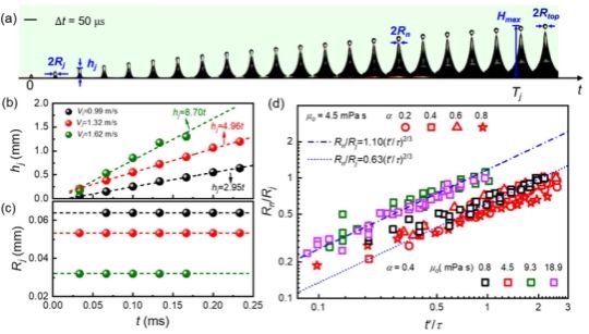 鉴于此,作者对水滴、硅油液滴以及油包水复合液滴在亲液表面上的撞击动力学进行了系统的对比实验研究。研究发现:奇异射流只发生在复合液滴的撞击中,并且射流发生的阈值取决于硅油的粘度和组成复合液滴的两种液体的体积比。此外,只有当奇异射流相当快且足够细时,才会破裂并喷射出次级液滴。文章还得出了次级液滴半径与射流半径的线性关系,以及射流速度与射流半径、射流颈部半径与时间、最大射流高度与射流时间之间的幂律关系。