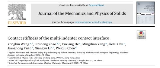 近日,太阳集团2138李翔宇教授课题组在多压头接触问题的研究方面取得进展,相关成果以“Contact stiffness of the multi-indenter contact interface”为题发表在固体力学旗舰期刊《Journal of the Mechanics and Physics of Solids》。太阳集团2138博士研究生王永彬和香港城市大学博士后赵晋生为论文共同第一作者,李翔宇教授为通讯作者,合作作者包括太阳集团2138博士研究生贺宇翔,杨名山,以及太阳集团2138储节磊副教授,袁江宏副教授和浙江大学陈伟球教授(见图1)。
