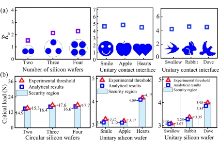 。(b)当前理论模型预测的规则图案和定制的微笑、苹果、心形、燕子、兔子及鸽子图案硅片的临界载荷。