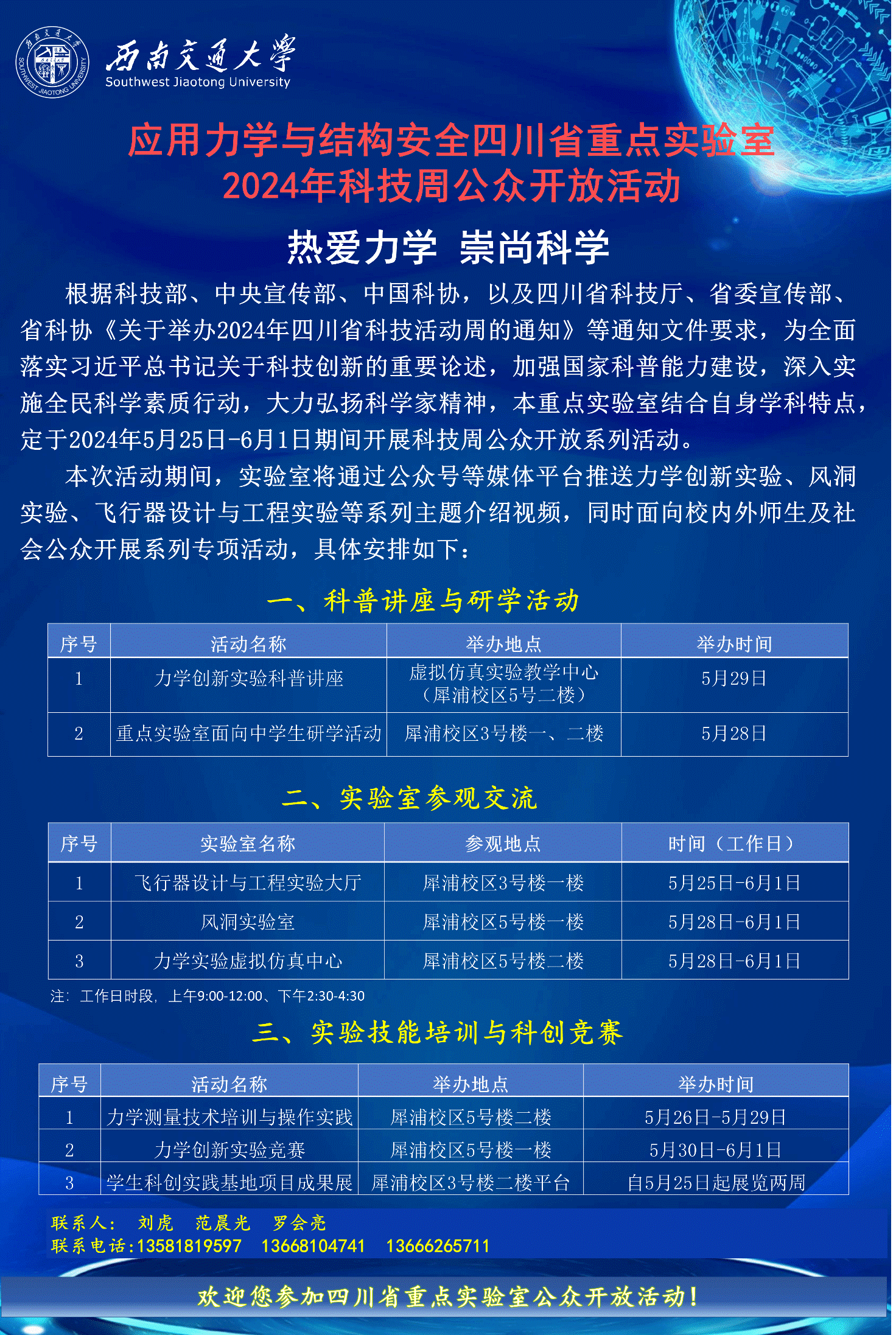 根据科技部、中央宣传部、中国科协《关于2024年全国科技活动周的通知》(国科发才〔2024〕31号)以及省科技厅、省委宣传部、省科协《关于举办2024年四川省科技活动周的通知》(川科普〔2024〕3号)等文件要求,落实习近平总书记关于科技创新的重要论述,加强国家科普能力建设,深入实施全民科学素质行动,大力弘扬科学家精神,树立热爱科学、崇尚科学的社会风尚。2024年5月25日-6月1日,太阳集团2138应用力学与结构安全四川省重点实验室结合自身人才培养特色和实验室资源,以“热爱力学,崇尚科学”为主题,面向全校师生、科技工作者、社会公众、大中小学生开展了“科技周公众开放”活动。