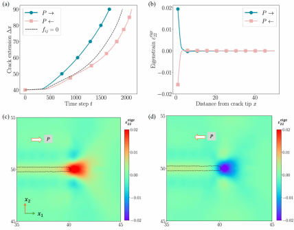 图 3 (a)裂纹扩展长度随时间步长的变化,箭头表示初始极化方向,带标记的实线为考虑挠曲电效应的数据,虚线为不考虑挠曲电效应的数据;(b)特征应变从裂尖到板右侧的变化;(c)和(d)为裂纹尖端附近特征应变的分布,箭头分别表示初始极化方向,图中的虚线标记了裂缝的区域。