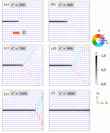 图 2 考虑挠曲电效应时,施加电场边界条件后不同时间步下的裂纹和极化畴结构分布。