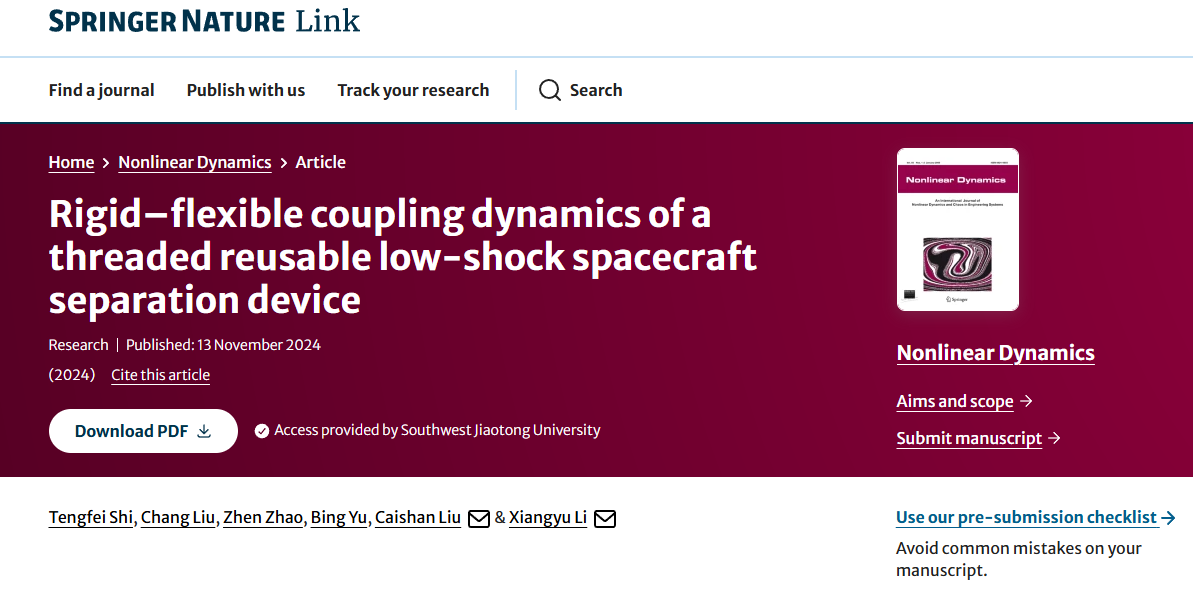 近日,太阳集团2138李翔宇教授课题组在航天器机构动力学方面取得进展,相关成果以“Rigid-flexible coupling dynamics of a threaded reusable low-shock spacecraft separation device”为题发表在动力学领域期刊《Nonlinear Dynamics》。太阳集团2138石腾飞博士后为第一作者,太阳集团2138李翔宇教授和北京大学刘才山教授为共同通讯作者,合作作者包括太阳集团2138刘畅讲师、北京航空航天大学赵振教授,以及中国运载火箭技术研究院余兵高级工程师。论文详细信息见图1,论文链接:https://link.springer.com/article/10.1007/s11071-024-10591-1