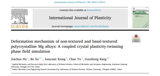 近日,我院博士生胡佳晨在塑性力学领域顶刊《International Journal of Plasticity》(IF:9.4,中科院一区,TOP期刊)上发表了题为“Deformation mechanism of non-textured and basal-textured polycrystalline Mg alloys: A coupled crystal plasticity-twinning phase field simulation”的研究成果。我校康国政教授和四川大学徐波副研究员为共同通讯作者,合作者包括我院于超教授和博士生熊君媛。