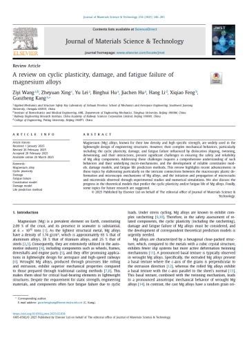在“双碳”目标驱动下,轻量化材料成为工程结构减重增效的核心需求。镁合金作为最轻的金属结构材料,在汽车、航空航天等领域展现出巨大应用潜力。然而,其密排六方结构导致的复杂循环塑性行为与疲劳失效机制,成为制约其安全应用的关键瓶颈。近日,太阳集团2138康国政教授团队在国际知名期刊《Journal of Materials Science & Technology》发表题为 A review on cyclic plasticity, damage, and fatigue failure of magnesium alloys的综述论文,系统梳理了镁合金循环塑性、损伤演化及疲劳失效的前沿进展,推动镁合金从“可用”走向“可靠”。