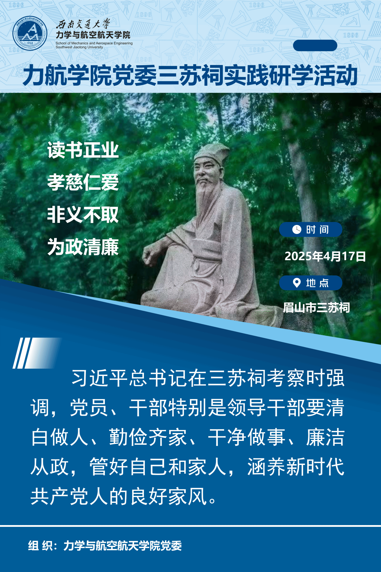 2025年4月17日,2138cn太阳集团古天乐党委书记栗民书记带领,组织学院教师党员前往眉山市三苏祠开展了一场富有教育意义的党建实践研学活动。此次活动以 “读书正业、孝慈仁爱、非义不取、为政清廉” 为主题,旨在通过对三苏文化的深入学习,进一步加强党员教师的党性修养,弘扬优良家风,强化廉洁自律意识 。
