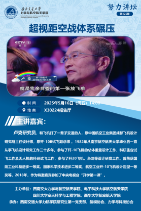 5月16日下午,中国航空工业集团成都飞机设计研究所研究员、航空专家卢克受邀到学院X30224报告厅作题为《超视距空战体系碾压》的专题讲座,学院党委书记栗民、院长李翔宇教授、党委副书记孔祥彬及我院和电子科技大学航空航天学院、四川大学空天与工程学院、西华大学航空航天学院百余名学生参加讲座。