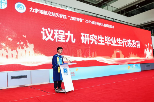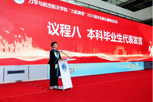 卓武同学作为本科生代表发言,他感谢四年里遇到的每一位老师和同学,愿与同学们一起,牢记和践行力航学院“严谨治学、严格要求”的双严传统,在奋斗中释放青春激情,为祖国建设添砖加瓦。