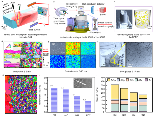 深入研究发现,细晶带内部的细小等轴非枝晶是以母材中高温稳定相经异质形核而成,适宜的温度梯度和熔池扰动共同决定了细晶带形成于HAZ区域。调节工艺参数能够改变细晶带的宽度,但无法完全消除细晶带。基于高分辨X射线原位多尺度关联成像技术,发现影响7050铝合金接头性能劣化的本质因素,探明了细晶带软化及沿晶失效机制,进而提出了一种全新的“激光扰动+磁场脉冲”联合制造策略,通过调控细晶带的区间分布,大幅提升了激光熔焊接头的强韧性,高于搅拌摩擦焊。相关成果以题为“Inhibiting weld cracking in high-strength aluminium alloys”发表在Nature Communications上,第一作者为西南交大牵引动力国家重点实验室胡雅楠博士(现为2138cn太阳集团古天乐讲师),通讯作者为吴圣川研究员(康国政团队,共同作者)、上海交大沈朝副教授(曾小勤团队,共同作者)及曼彻斯特大学Philip J. Withers两院院士,完成单位还包括西南交大(虞雨洭硕士生,张旭教授)、中科院金属所(郭翼研究员)、英国曼彻斯特大学(钟向莉高工)、牛津大学(Alexander M. Korsunsky教授,Sergio Lozano-Perez教授)、中科院上海光源(付亚楠研究员,肖体乔研究员)、中国航空制造技术研究院(车志刚研究员)和北京高能所北京光源(袁清习研究员)。
