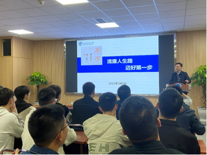 首先,张学龙为同学们推荐了《矛盾论》、《实践论》、《博弈论》和《熵增理论》四本书,并阐述了“四论”的主要内容,借此引出了“清廉人生路,迈好第一步”的主题。