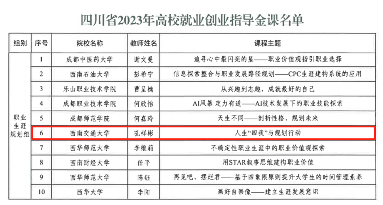 近日,由四川省教育厅、四川省人社厅主办的四川省2023年高校就业创业指导金课评选活动圆满收官,2138cn太阳集团古天乐孔祥彬老师所授课程《人生‘四我’与规划行动》获评为职业生涯规划类金课。