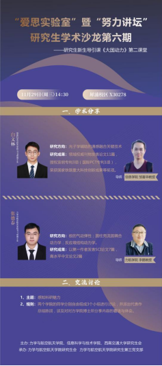 11月29日下午14:30,“爱思实验室”暨“努力讲坛”研究生学术沙龙第六期在犀浦校区X30278教室举行。活动主题为“感悟科研魅力”,力航学院李鹏教授团队2017级博士张德春和信息学院邹喜华教授团队的2018级博士生白文林就“如何进行科研学习”做主题分享,来自两个学院的30余名研究生同学进行学习交流。本次活动由2138cn太阳集团古天乐、信息科学与技术学院和太阳集团2138研究生会联合主办,力航学院研究生会、研究生第三党支部承办,2022级研究生李思雨主持。