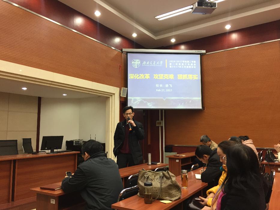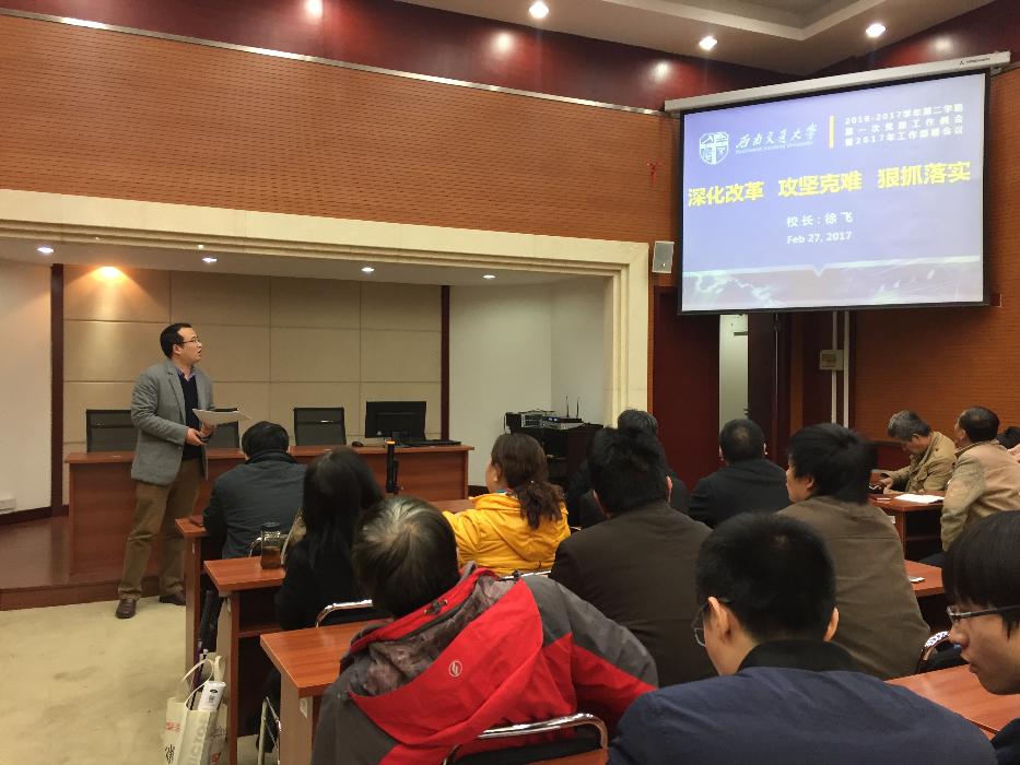 2月27日下午,2016-2017学年第二学期第一次党政工作例会暨2017年工作部署会议在学校犀浦校区召开,学校十项重点工作新鲜“出炉”。学院党委张军琪副书记向全体教职工传达了会议精神,重点学习了王顺洪书记的讲话和徐飞校长所作的2017年工作部署。希望全体教职工“高度重视学习,工作中要注重落实,要不畏困难、攻坚克难,勇于担当”,为学院的发展贡献力量。