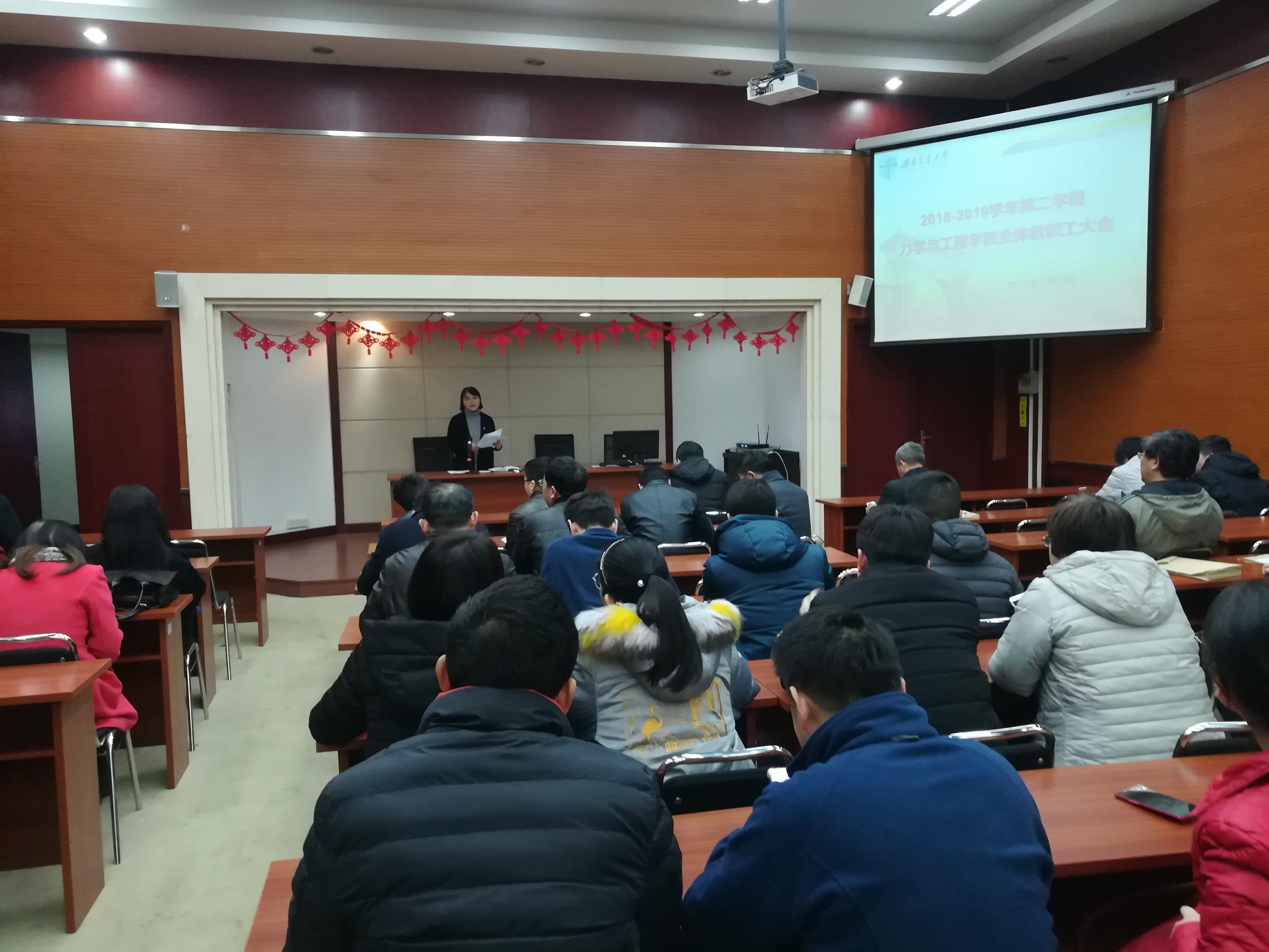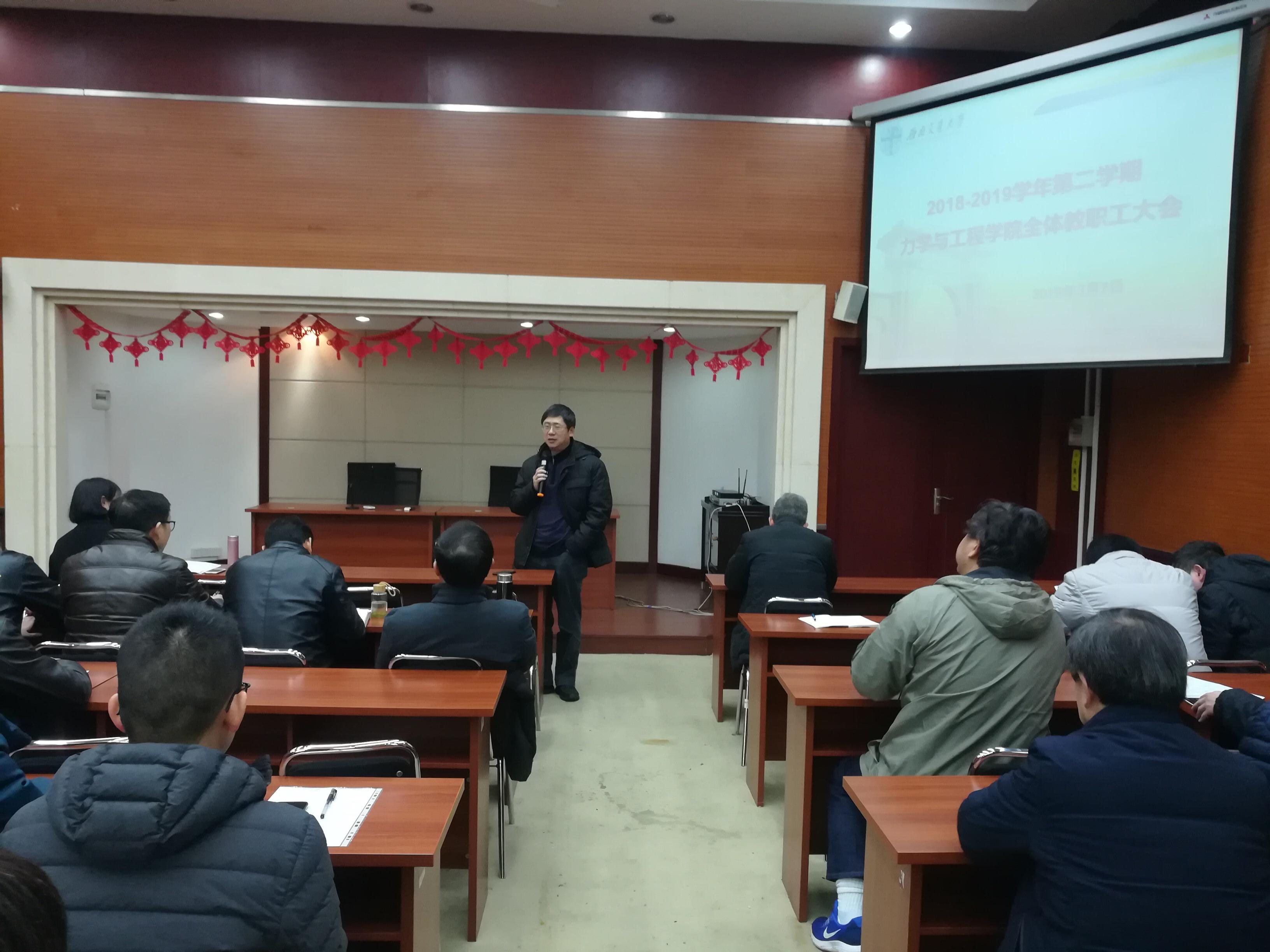 力学与工程学院20182019学年第二学期第一次教职工大会于2019371400在九里校区1号综合楼240学术会议厅召开。学院全体教职工参加本次会议。会议由学院党委书记栗民主持。