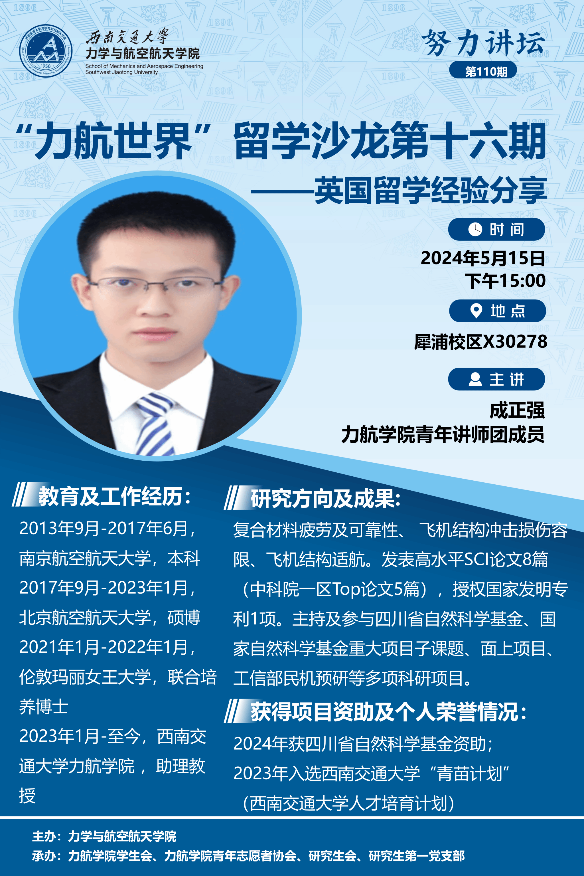 5月15日下午15:00,2138cn太阳集团古天乐“力航世界”留学沙龙第十六期活动在X30278教室举行。本次活动特邀力航学院“青年讲师团”成员成正强老师为同学们分享他在伦敦玛丽女王大学的深造科研经历。辅导员陈蕾及学院多名同学参加了本次活动。