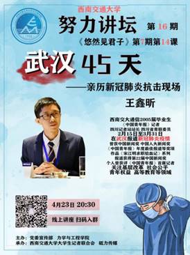 4月23日晚,《中国青年报》四川记者站站长、我校校友王鑫昕受邀作客“努力讲坛”第十六期,讲述了亲历武汉新冠肺炎抗击现场的45天。本次讲座由党委宣传部、力学与工程学院主办。