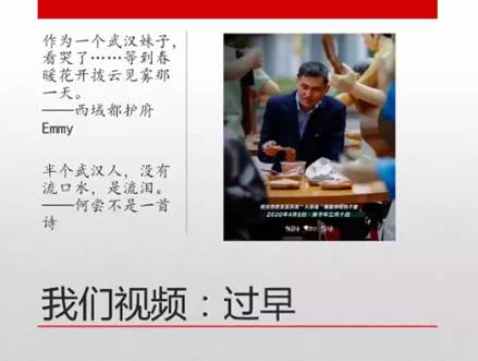 然后,通过分享视频——《过早》,让我们看到武汉复苏的一个记录,这也是全国从新型冠状病毒肺炎慢慢复苏的缩影,在国家强大力量的支撑中,在众多人的努力中,我们挺过了最艰难的时候,疫情的阴影逐渐散去。