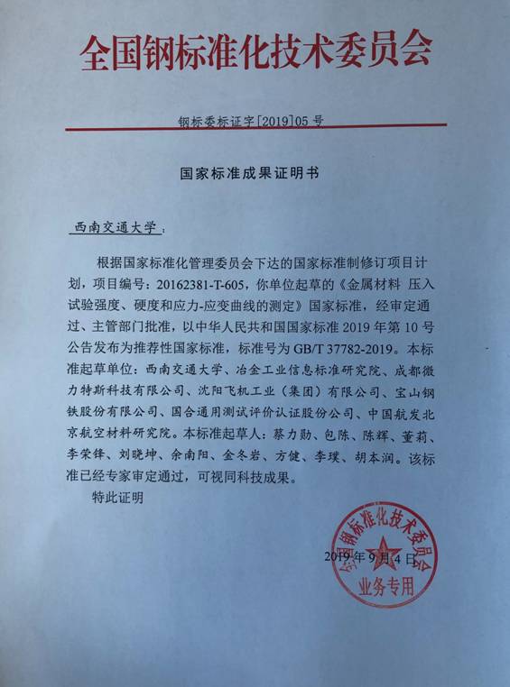 2019年8月30日,国家标准委员会正式发布了国家标准《金属材料压入试验强度、硬度和应力-应变曲线的测定》(GB/T 37782—2019)。具有我国自主知识产权的该项新标准,由太阳集团2138力学与工程学院蔡力勋教授主持、包陈副教授执笔起草,起草单位包括:太阳集团2138、冶金工业信息标准研究院、成都微力特斯科技有限公司、沈阳飞机工业(集团)有限公司、宝山钢铁股份有限公司、国合通用测试评价认证股份公司、中国航发北京航空材料研究院。