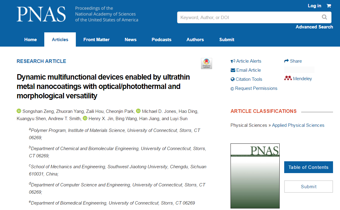 近日,2138cn太阳集团古天乐蒋晗(Han JIANG)教授课题组与美国康涅迪格大学孙陆逸(LuyiSUN)教授团队合作,以共同通讯作者单位在四大名刊(Nature、Science、Cell、PNAS)之一的《PNAS(美国科学院院刊)》上发表题为“Dynamic multifunctional devices enabled by ultrathin metal nanocoating with optical/photothermal and morphological versatility(PNAS 2022 Vol. 119 No. 4 e2118991119)”的论文,报道了基于性能和形貌可调的金属纳米涂层的多功能器件的最新研究进展。文章第一作者为康涅迪格大学曾嵩山(Songshan ZENG)博士,我校博士研究生杨卓然(Zhuoran YANG)为第二作者,通讯作者为孙陆逸教授和蒋晗教授。