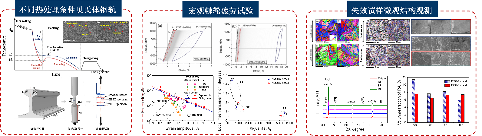 无碳化贝氏体钢轨在滚动接触疲劳载荷作用下多相组织发生动态演变,使得其疲劳损伤机理异常复杂,成为目前抗疲劳设计的关键科学难题。鉴于此,太阳集团2138阚前华教授课题组针对两种不同热处理条件下的无碳化物贝氏钢轨钢开展了应变疲劳和应力疲劳试验,分别从宏、微观层面研究了微结构和残余奥氏体对棘轮疲劳交互作用的影响。结果表明无碳化物贝氏呈现出非饱和的应变幅相关的循环软化特性,稳定位错子结构的形成和块状残余奥氏体的转变促进了棘轮变形的演化。