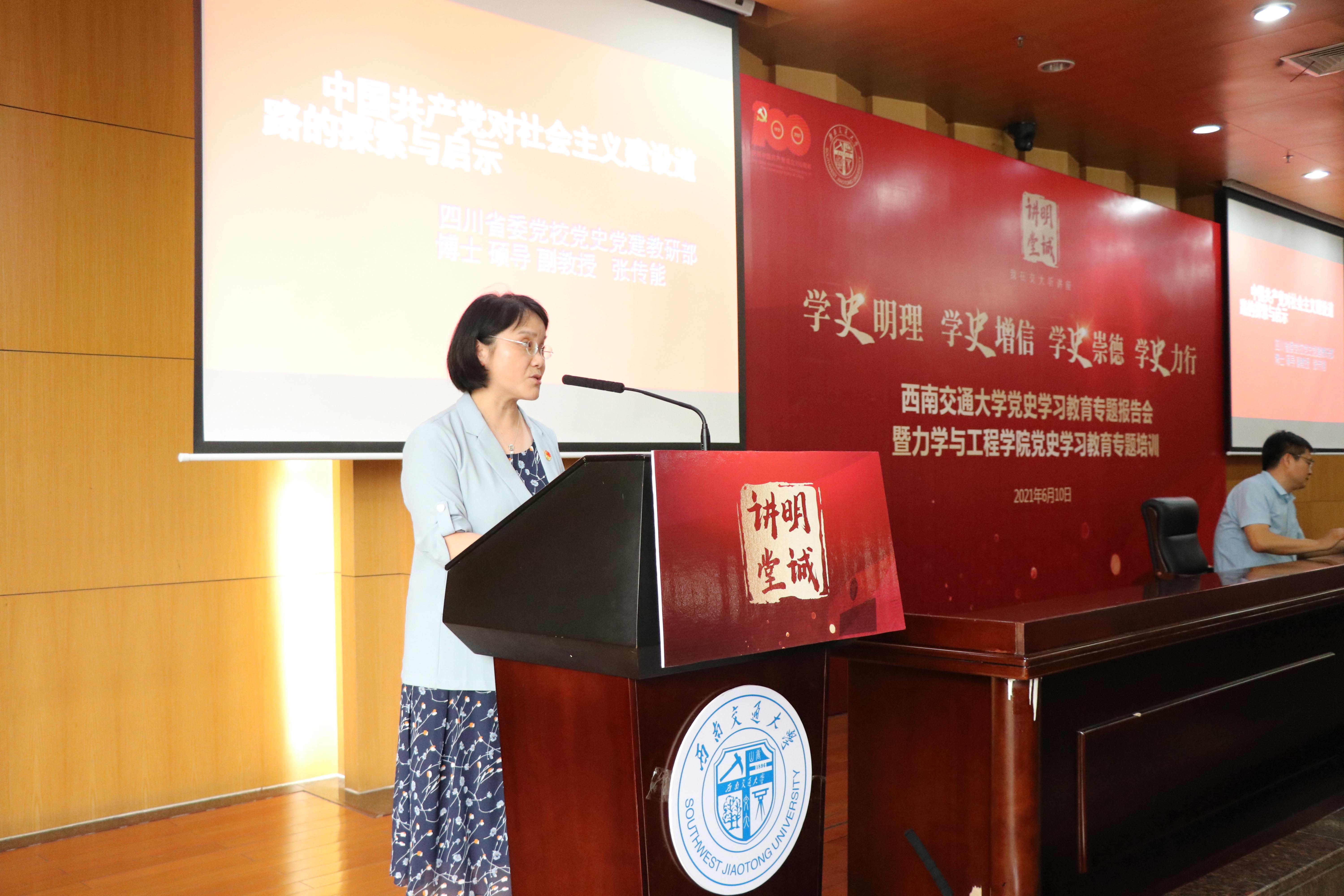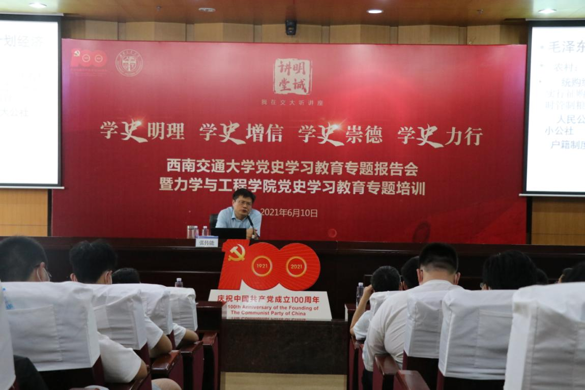 6月10日下午,太阳集团2138“明诚讲堂”党史学习教育专题报告会暨力学与工程学院党史学习教育专题培训在犀浦校区图书馆第二报告厅举行。中共四川省委党校教授张传能作了专题报告。本次报告会由党委宣传部和力学与工程学院党委联合举办,力学与工程学院党委书记栗民、院长康国政、学院其他领导班子成员、党委委员、各党支部书记及委员、师生近300人参加了此次报告会,学院党委书记栗民主持报告会。