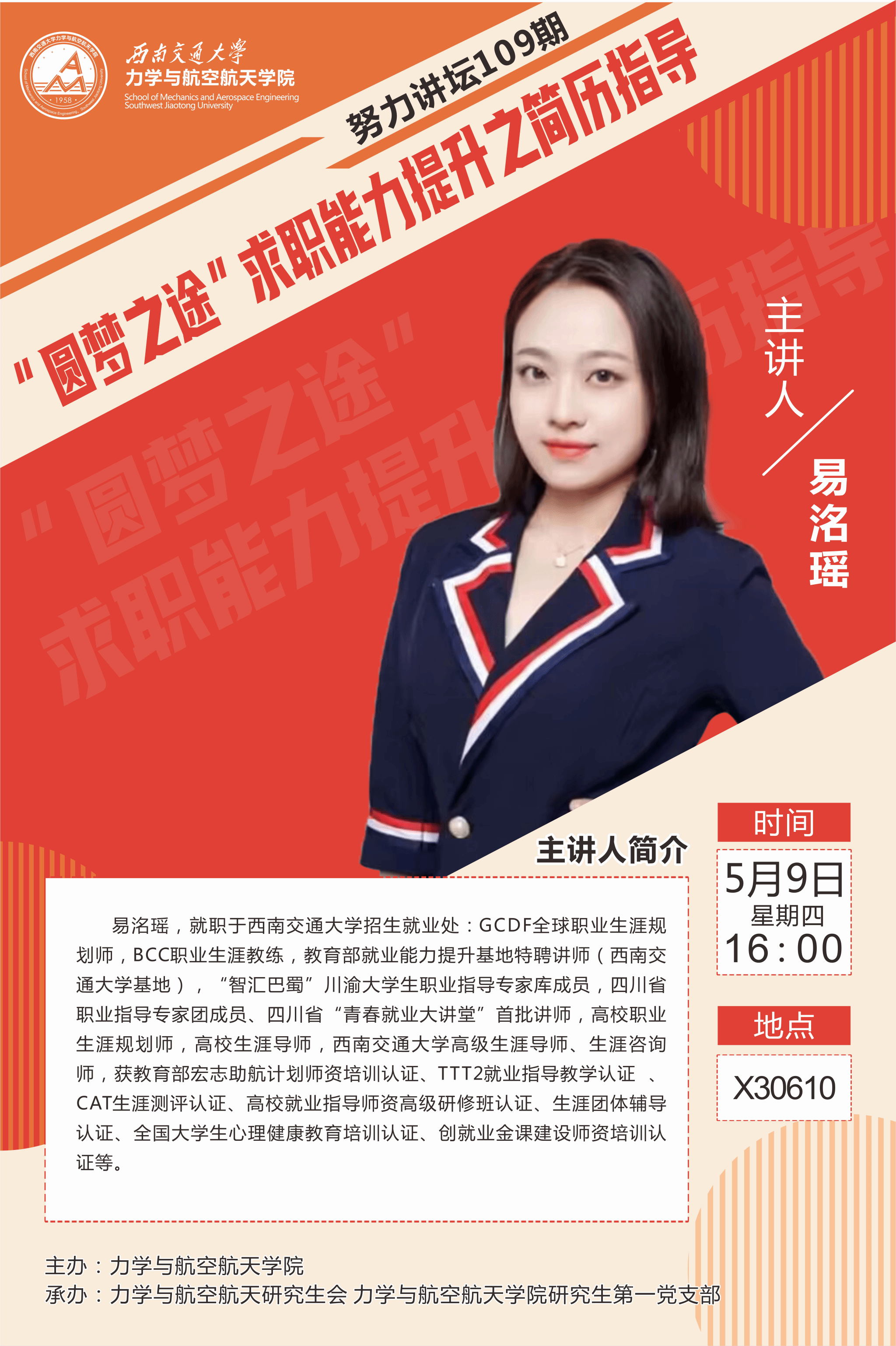 5月9日16:00,2138cn太阳集团古天乐“力久弥新,航宇未来”生涯咨询室在犀浦校区X30610教室成功举办了“努力讲坛”第109期活动,主题为“圆梦职途”求职能力提升之简历指导。此次活动特邀了我校太阳集团处的GCDF全球职业生涯规划师、教育部就业能力提升基地特聘讲师易洺瑶,为2025届应届毕业生在职业目标选择和简历撰写方面提供了专业指导。