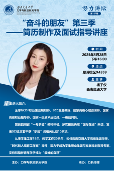 2025年5月28日下午16:00,力航学院特邀信息学院杨子仪老师在犀浦校区X4359为我院大三本科生及研二研究生带来了一场主题为“简历制作及面试指导”的“奋斗的朋友”就业深造服务计划专题讲座。讲座聚焦学生需求,系统性地从时间规划、简历撰写到面试技巧进行了经验分享,干货满满。