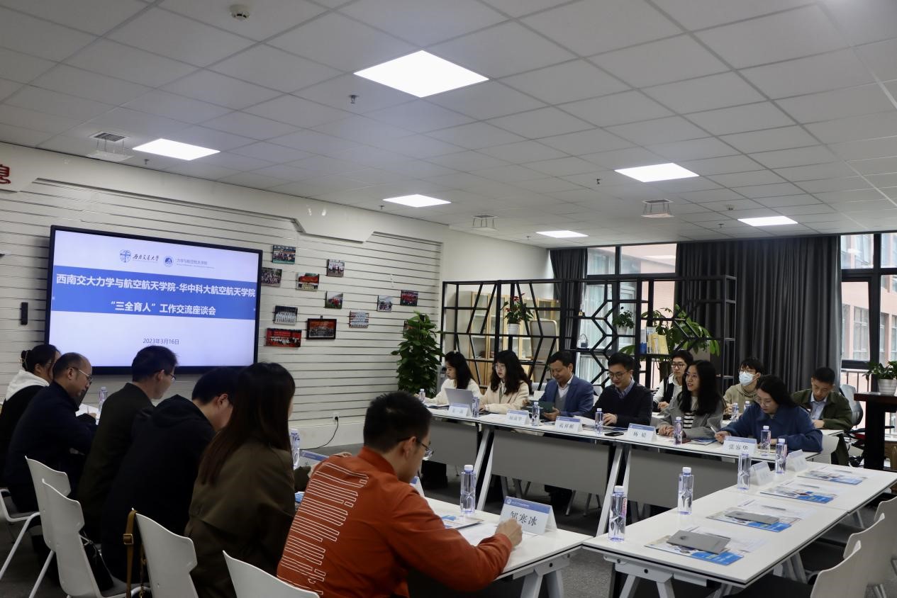 上午,华中科技大学一行与我院师生进行“三全育人”工作交流座谈。宋建涛、阚前华分别介绍本院发展概况、教育教学、科学研究等。孔祥彬就学院“三全育人”工作进行了详细汇报。宋建涛、王琳对我院人才培养工作给予高度评价,认为西南交大力航学院在“三全育人”工作中形成了很多行之有效的工作方法和模式,非常值得借鉴。
